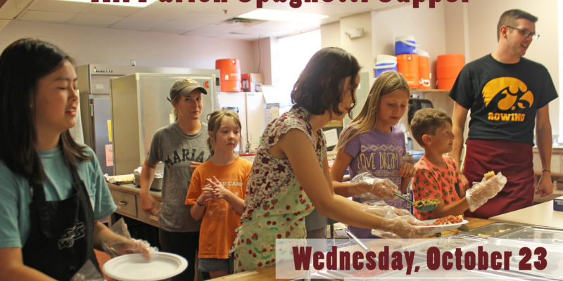 All parishioners are invited for a parish spaghetti supper on Wednesday, October 23 in the MPR. Come any time from 5 to 6:15 p.m.! Contact Theresa at [email protected] with questions.