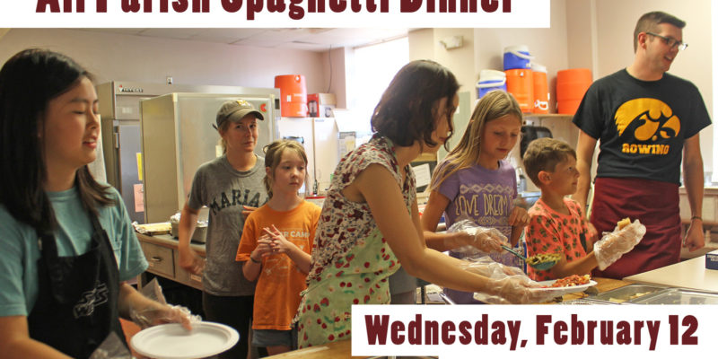 All parishioners are invited for a parish dinner on Wednesday, February 12 from 5 to 6:15 p.m. in the MPR.